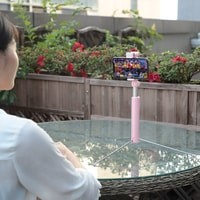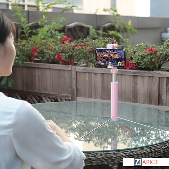 Главной особенностью данного устройства является наличие подсветки для фото. Также оснащена встроенным складным триподом, который размещается в основании корпуса устройства.В комплект поставки входит специальный Bluetooth пульт и кабель для зарядки microUSB.