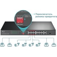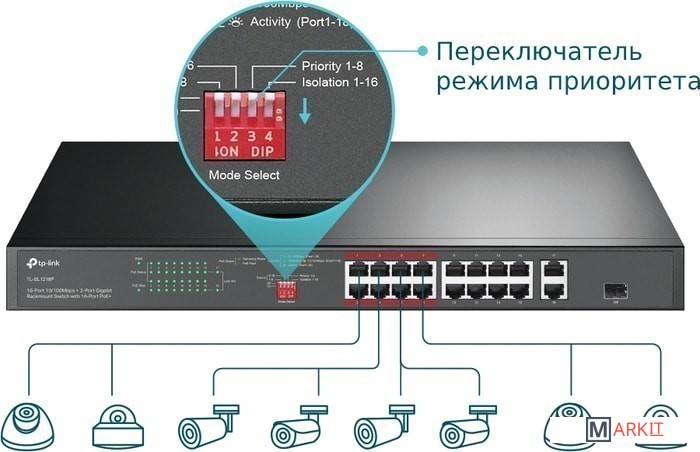 Режим изоляции, включаемый одним нажатием, без труда разделяет трафик портов 1–16 с целью предотвращения перехвата и вмешательств, позволяя коммутатору обеспечить защиту от широковещательных штормов, а также улучшить передачу данных и безопасность сети LAN.При превышении общей мощности 150 Вт умное распределение питания отключит питание портов с низким приоритетом, чтобы обеспечить питание портов с высоким приоритетом и защитить устройство от перегрузки. Также имеется автоматическое обнаружение и подача необходимого питания на PoE‑устройства с защитой от повреждений оборудования с PoE и без PoE.Благодаря режиму расширения дальность передачи PoE достигает 250 м - подходит для размещения IP‑камер на большой территории.