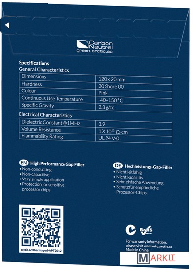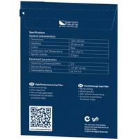 Твердость: - 35 Shore OOУдельный вес: - 2,3 г / см³Прочность на разрыв: - 0,4 кН / мДиэлектрическая проницаемость при 1 МГц: - 3,9Объемное сопротивление: 1x10^12 Ом-смРейтинг воспламеняемости: UL 94 V-0В комплекте 4 термопрокладки.