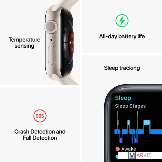 Основные особенности:- режим Always-on-Display- защищенный сапфировым стеклом OLED Retina дисплей с яркостью до 1000 нит- обновленный датчик сердечного ритма третьего поколения- датчик измерения кислорода в крови и ЭКГ- отслеживание показателей сна- новый датчик для измерения температуры тела (с оповещением об отклонении от нормы и овуляции)- поддержка GPS стандарта L1, ГЛОНАСС, Galileo, QZSS и BeiDou- компасс и встроенный альтиметр- класс защиты от внешний воздействий IP6X- водонепроницаемость при погружении до 50 метров- дренажное отверстие для вывода влаги после использования в воде- обновленный гироскоп и акселлерометр, которые позволяют фиксировать падение и удар при аварии- встроенный динамик и микрофон для приема звонков- поддержка бесконтактных платежей ApplePay- режим экономии энергии (который позволяет устройству работать до 36 часов от одной подзарядки)- беспроводная зарядка по стандарту Qi (с поддержкой MagSafe)- в комплекте метровый зарядный кабель с разъемом USB Type-C- доступ к вотчфейсам от Nike