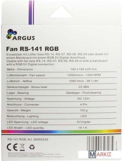 26 светодиодов RGB.Прозрачное кольцо вокруг вентилятора с 8 светодиодами RGB.Подключается через 4-pin на материнской плате и дополнительно подключается к 3-контактному 5V RGB-разъему материнской платы, который отвечает за синхронное изменение цвета всех подключенных компонентов.5pin для подключения к контроллерам Argus RS-04 и RS-06.