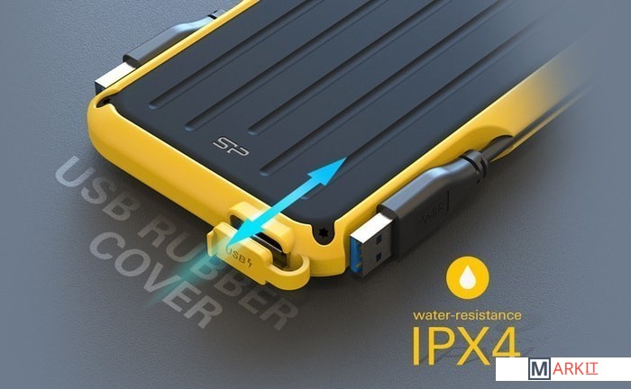 Armor A66 - это настоящий «внедорожник» среди портативных накопителей, который легко справится с ударами, падениями, попаданием под ливень в отпуске и бытовой пылью в офисе. Корпус устройства защищён мягким резиновым бампером, который помогает поглотить силу удара при случайном падении и защищён от попадания брызг и капель воды со стандартом водонепроницаемости IPX4, что помогает сохранить накопитель в целости и сохранности.